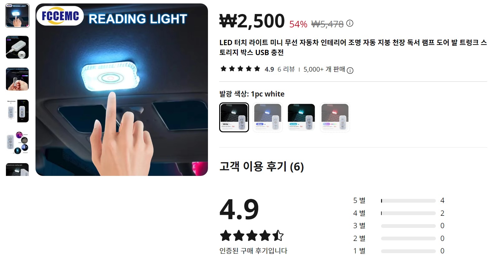 차량용 내부등이라는데 터치 스위치라 쉽게 켜고 끌 수 있는데 생각보다 밝지 않은 것 같다.