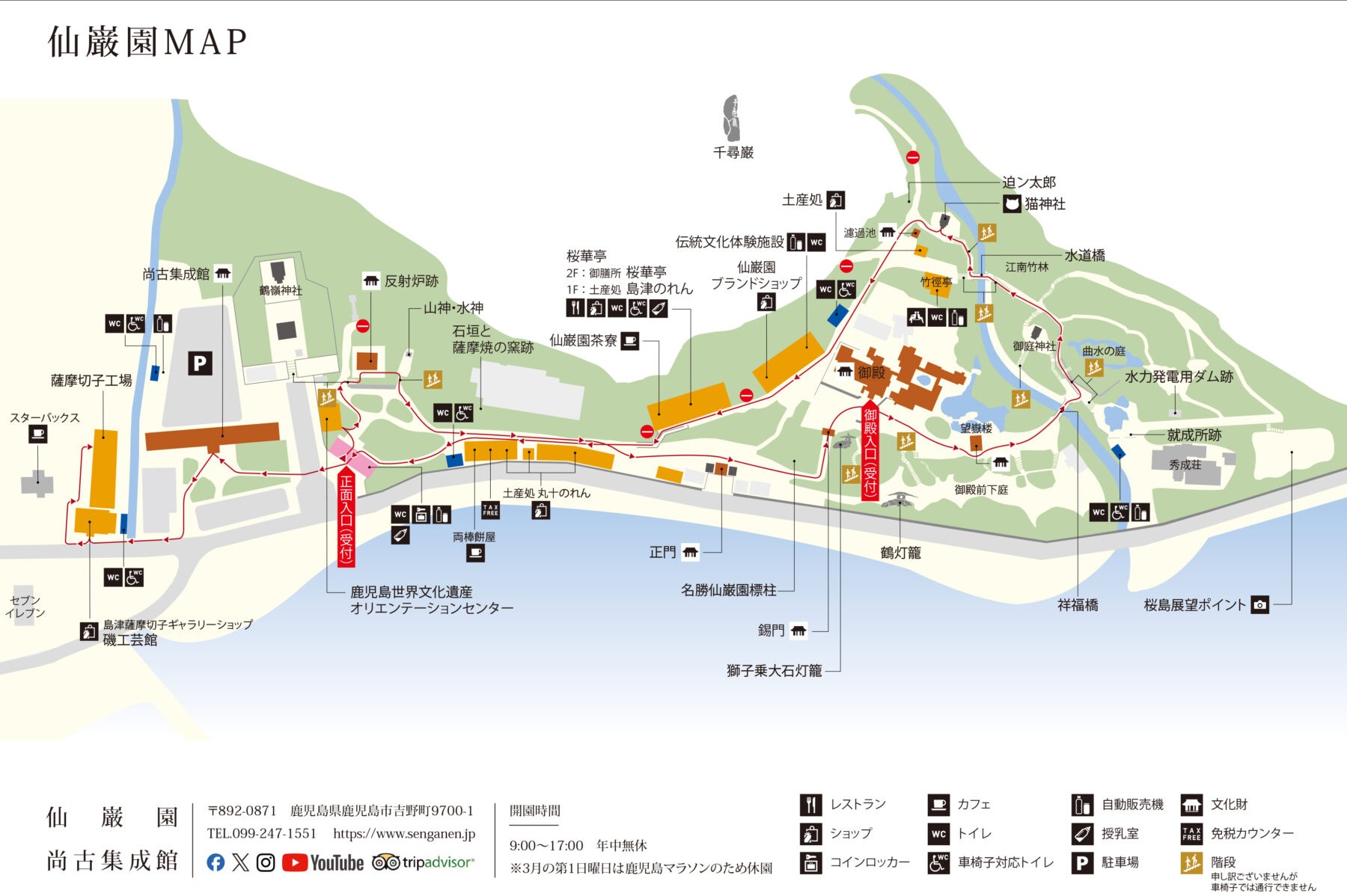 1658년에 시마즈(島津)家 19대 당주인 미쓰히사에 의해 지어졌습니다. 사쿠라지마를 조망할 수 있는 훌륭한 정원은 가고시마현을 대표하는 절경 중 하나입니다. 사계절마다 형형색색 꽃이 피는 1만 5천 평의 부지 내에는 사쓰마번과 시마즈(島津)家 에 관한 자료와 문화재가 전시되어 있는 쇼코 슈세이칸과 저택이 있습니다. 일본의 근대화를 앞당긴 곳으로서 일대는 2015년에 세계문화유산에 등록되었습니다.