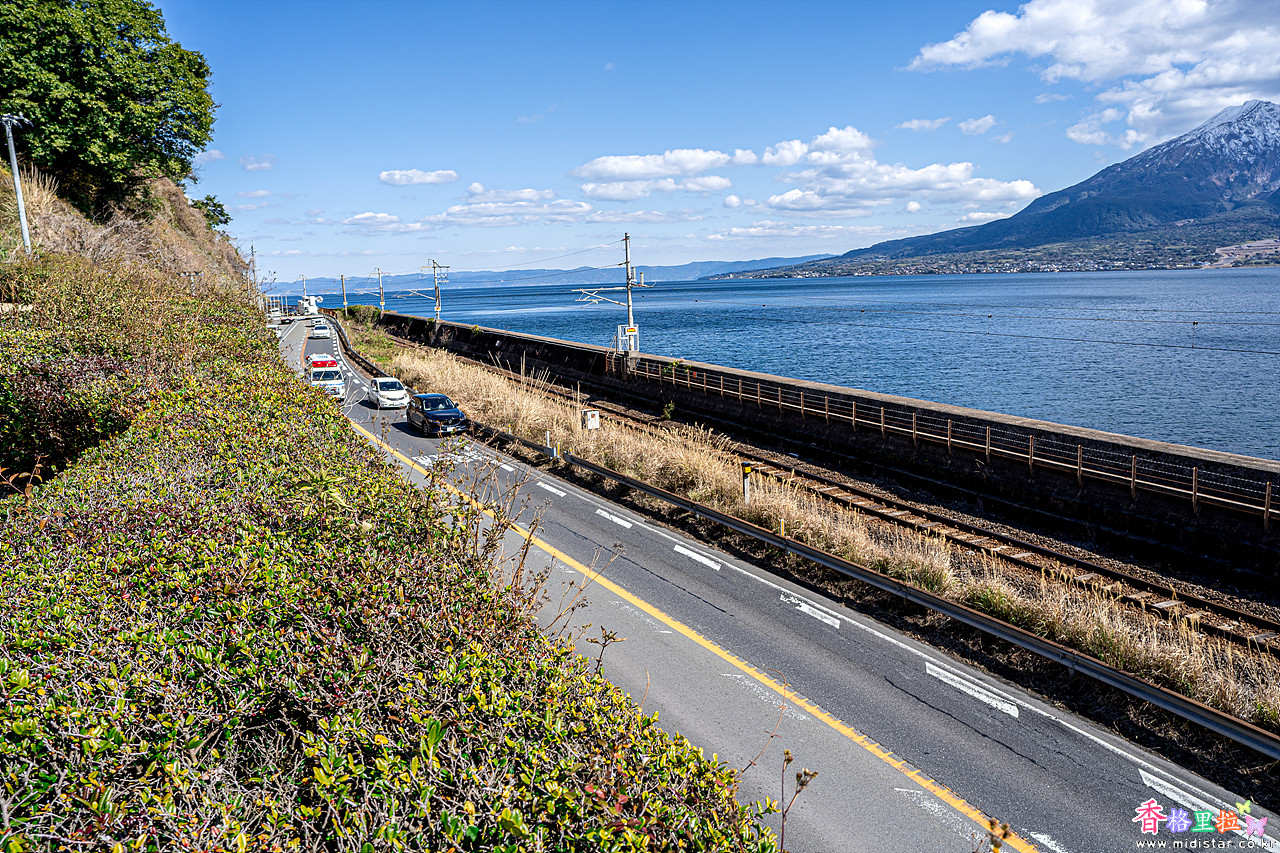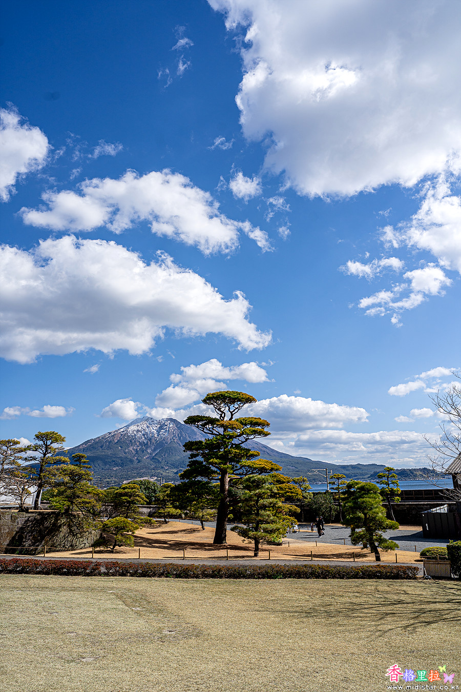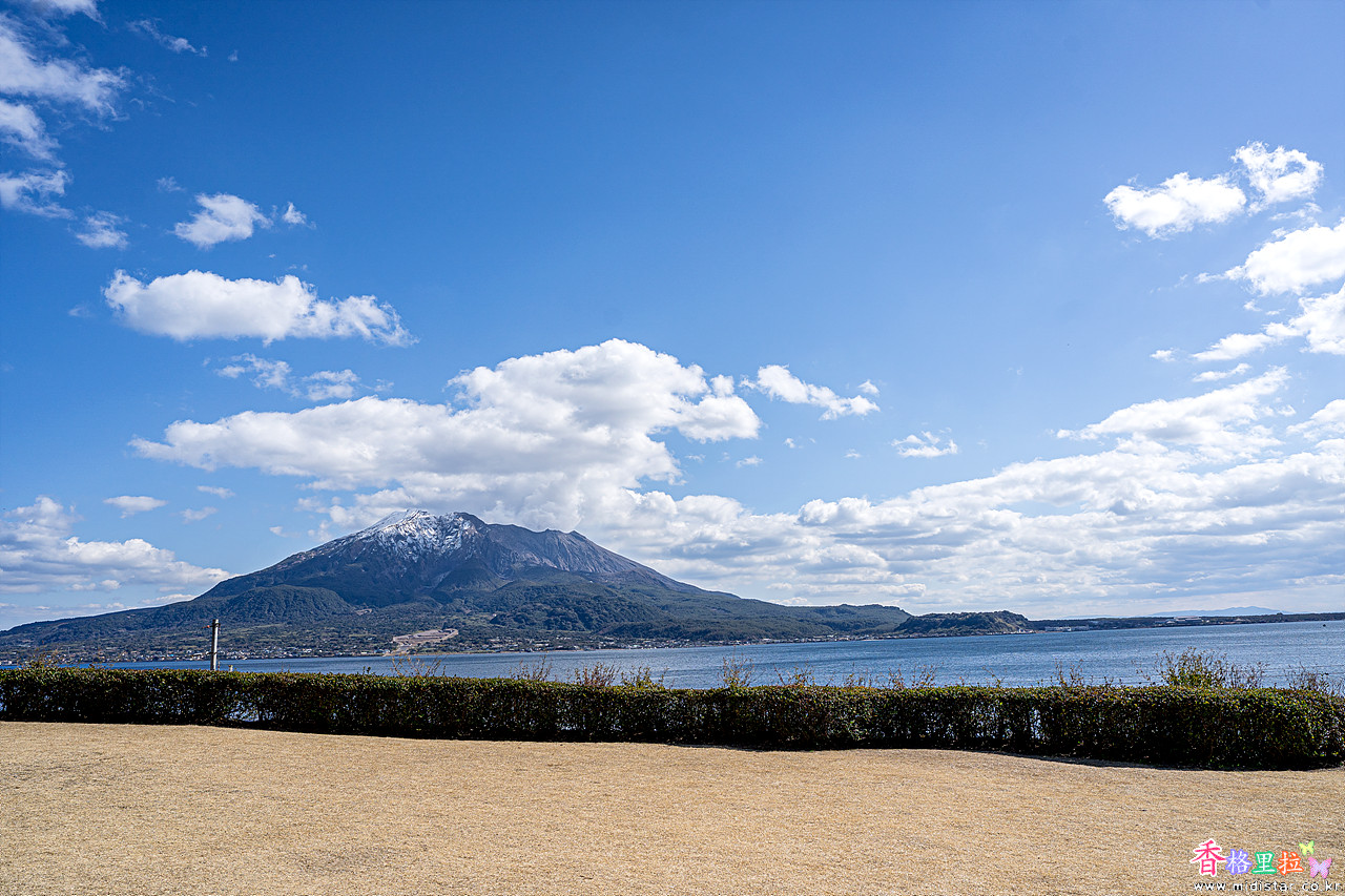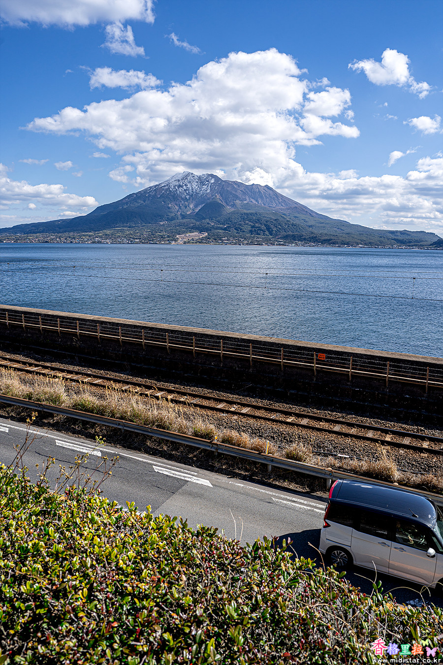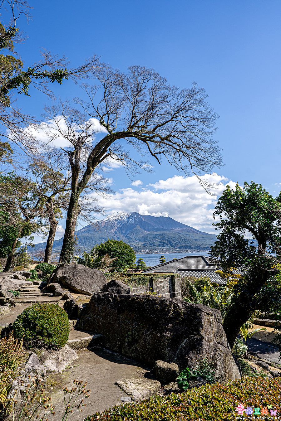 눈이 쌓인 사쿠라지마(桜島)가 잘 보이는 명당이다.