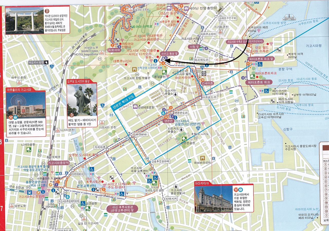 가고시마 페리선착장에서 센간엔(仙巖園)으로 가기 위해서 관광버스를 타고 가려고 가고시마(鹿児島) Cute Pass를 살 때 나누어준 교통지도를 보니 다시 가고시마주오(鹿児島中央) 역으로 가서 한참을 돌아가야 된다. 관광버스가 시계방향 쪽으로만 운행하고 반대방향으로는 운행하지 않는다.