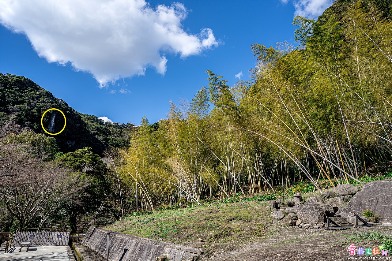노란 원형안의 큰 바위에 새겨진 센진간(千尋巌)의 3글자는 약 3,900명의 사람들이 3개월에 걸쳐 새겼다고 한다.