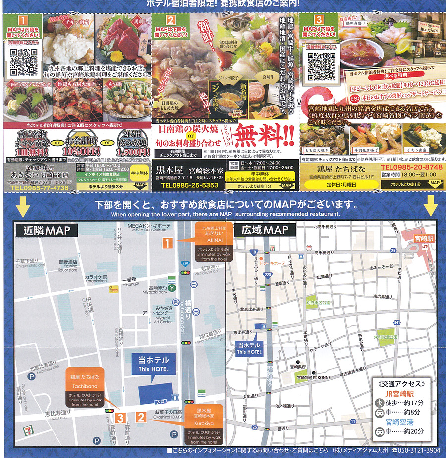 호텔 Mystays Miyazaki와 제휴한 식당은 Akinai,구로기야(黑大屋), 니와도리야(鷄屋) 다치바나 3군데 가 있었다.
