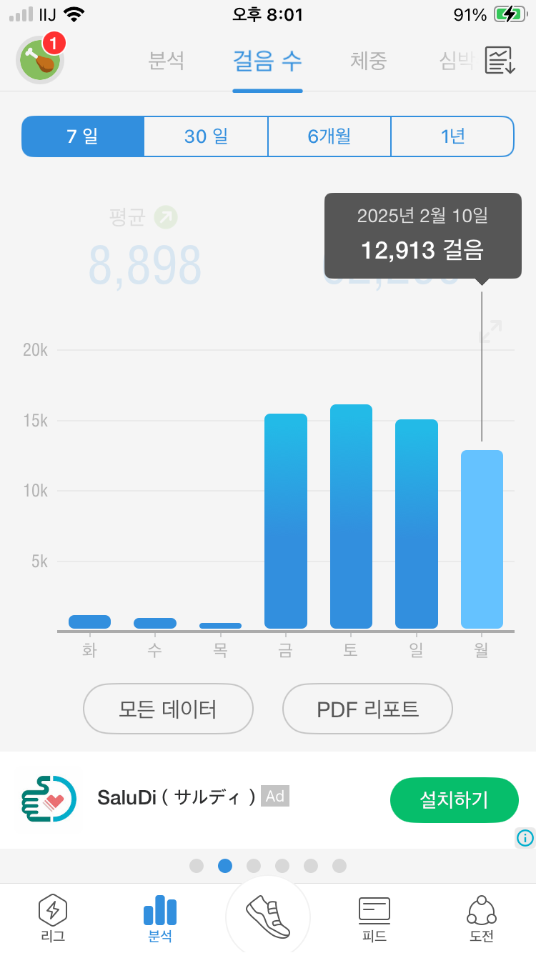 오늘은 12,913걸음을 걸었다.