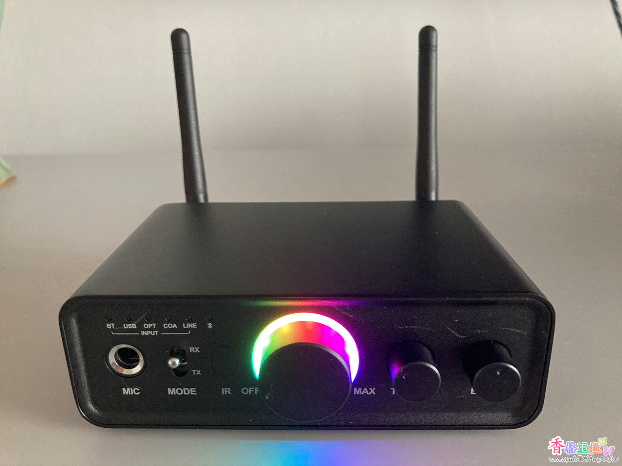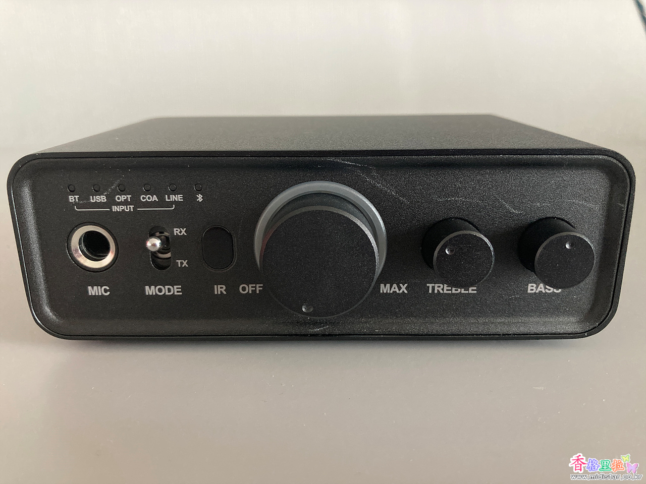 전면에 상태표시 시그널램프, MIC, MODE RX TX 선택 스위치, IR (적외선 센서) 전원 버튼 겸 볼륨, TREBLE BASS 놉(Knob)이 있다.