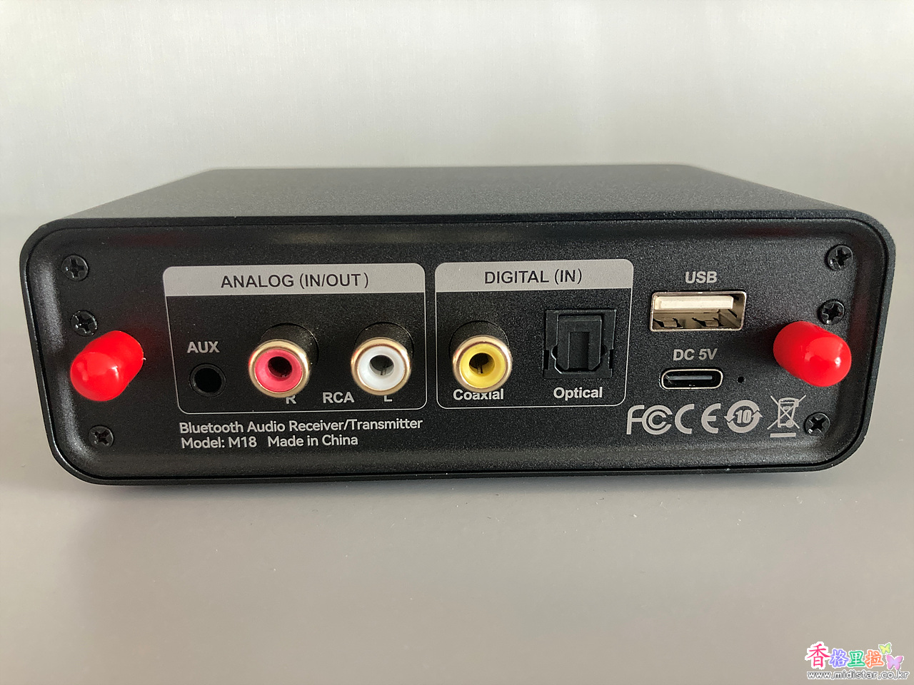 뒷면은 양쪽에 Blutooth 안테나 연결 단자, Analog 입출력 단자,Digital 입력단자 동축(Coxial) 광단자(Optical), USB 입력 단자,