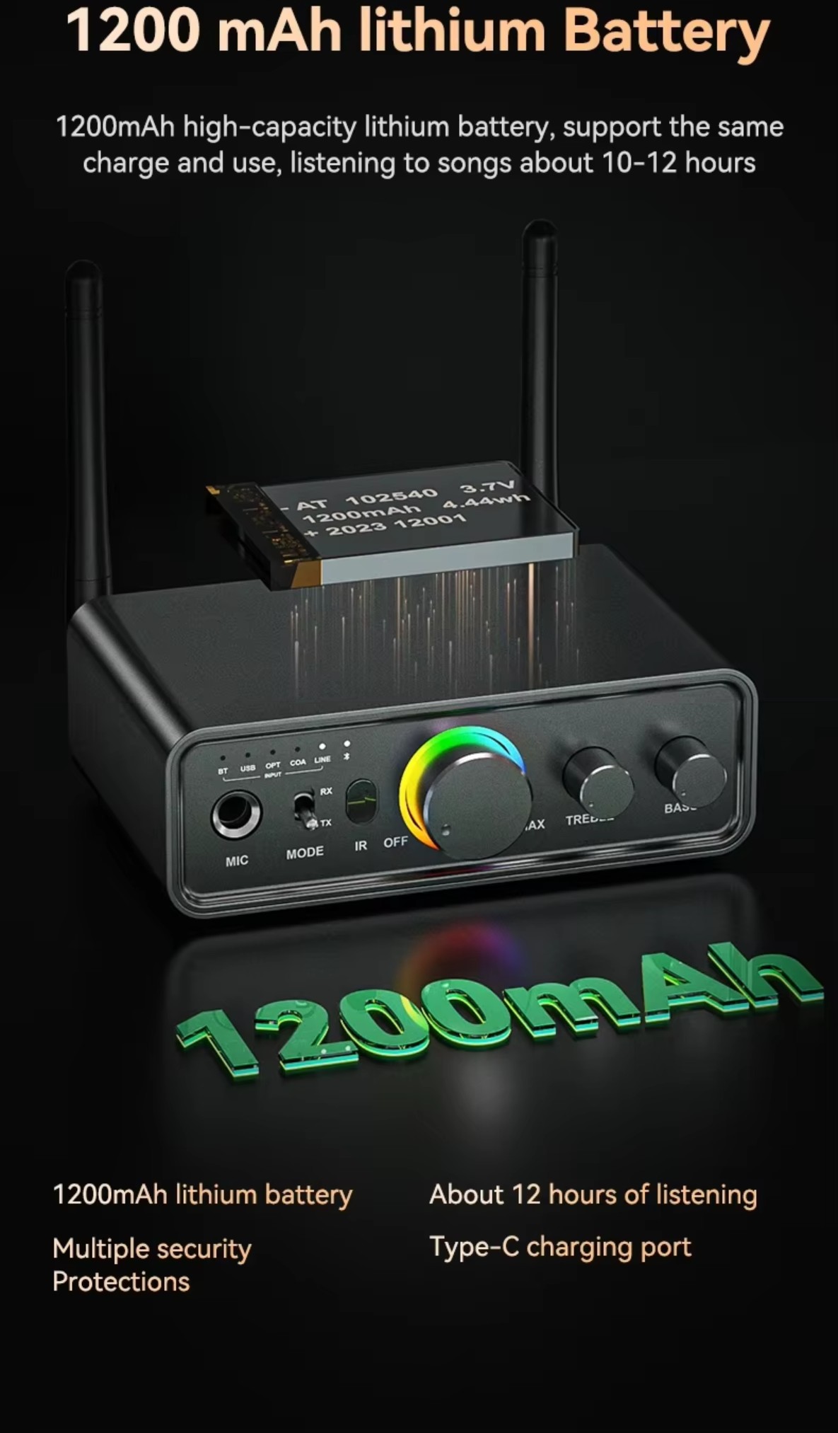 1,200mAh의 Lithium Battery를 내장하고 있어서 외부 전원 공급 없이 약 12시간 Play 할 수 있다.
