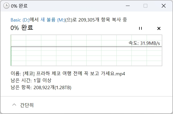 그런데 1.28 TB를 복사하려니 1일 이상 걸린다고 나온다. 느려도 너무 느려서 복사를 취소하고 다른 방법을 선택했다.