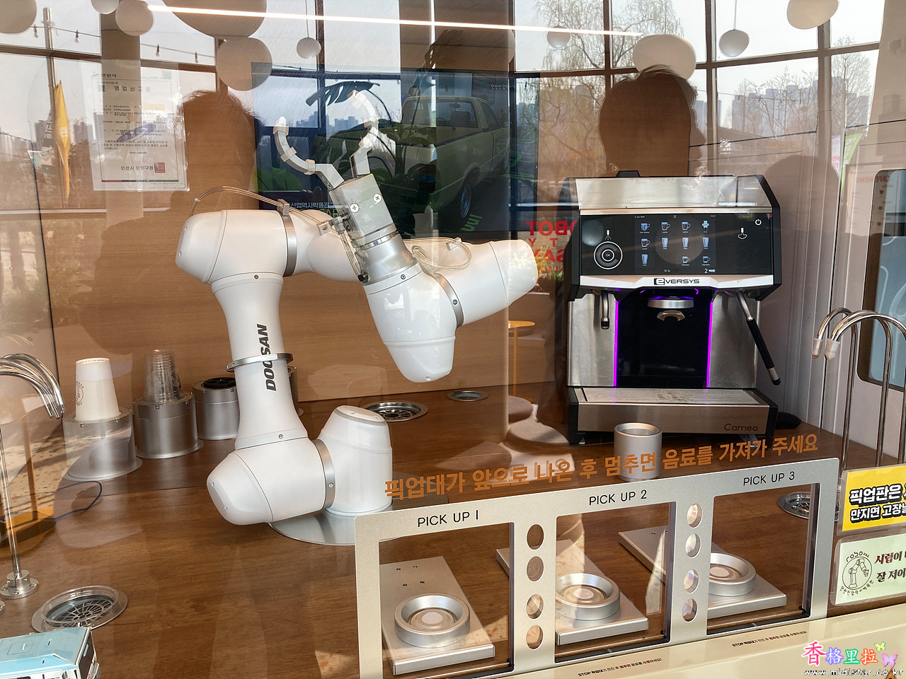 나도 한잔 마셔보았는데 맛은 그저 그렇다. 주인이 미리 셋팅한 배합비율이 들어간 음료를 자동으로 사람 손으로 가져다 주는 것이지 로봇이 직접 제조하지는 않는 것이다.
