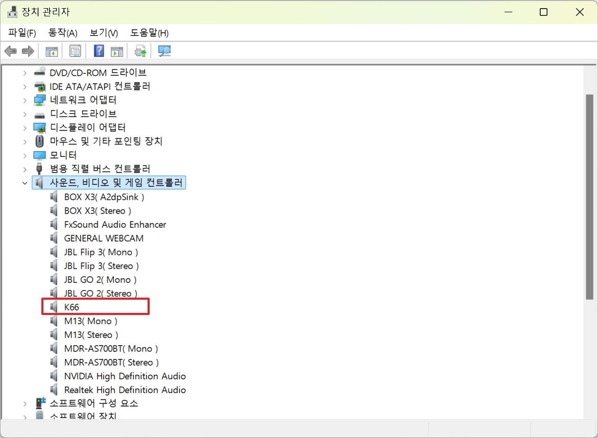 OBS 프로그램에서도 MIC/Aux 오디오에서 마이크(K66)를 선택해 주면 된다.