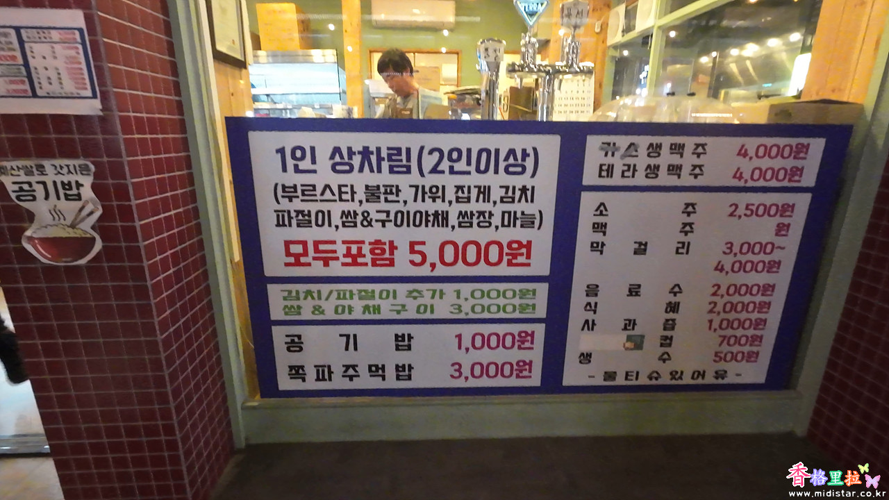 정육점에서 고기를 사고 상차림 집에서 1인 5,000원에 가스, 불판, 반찬등을 준비해 준다.