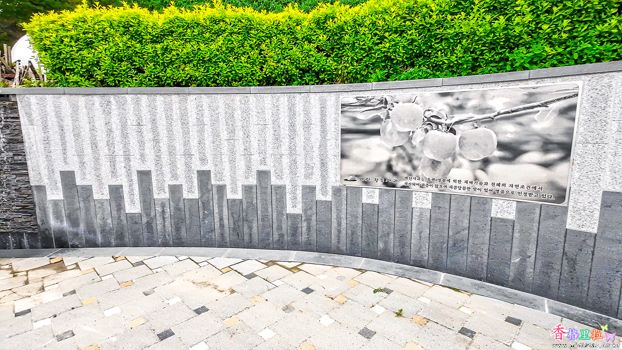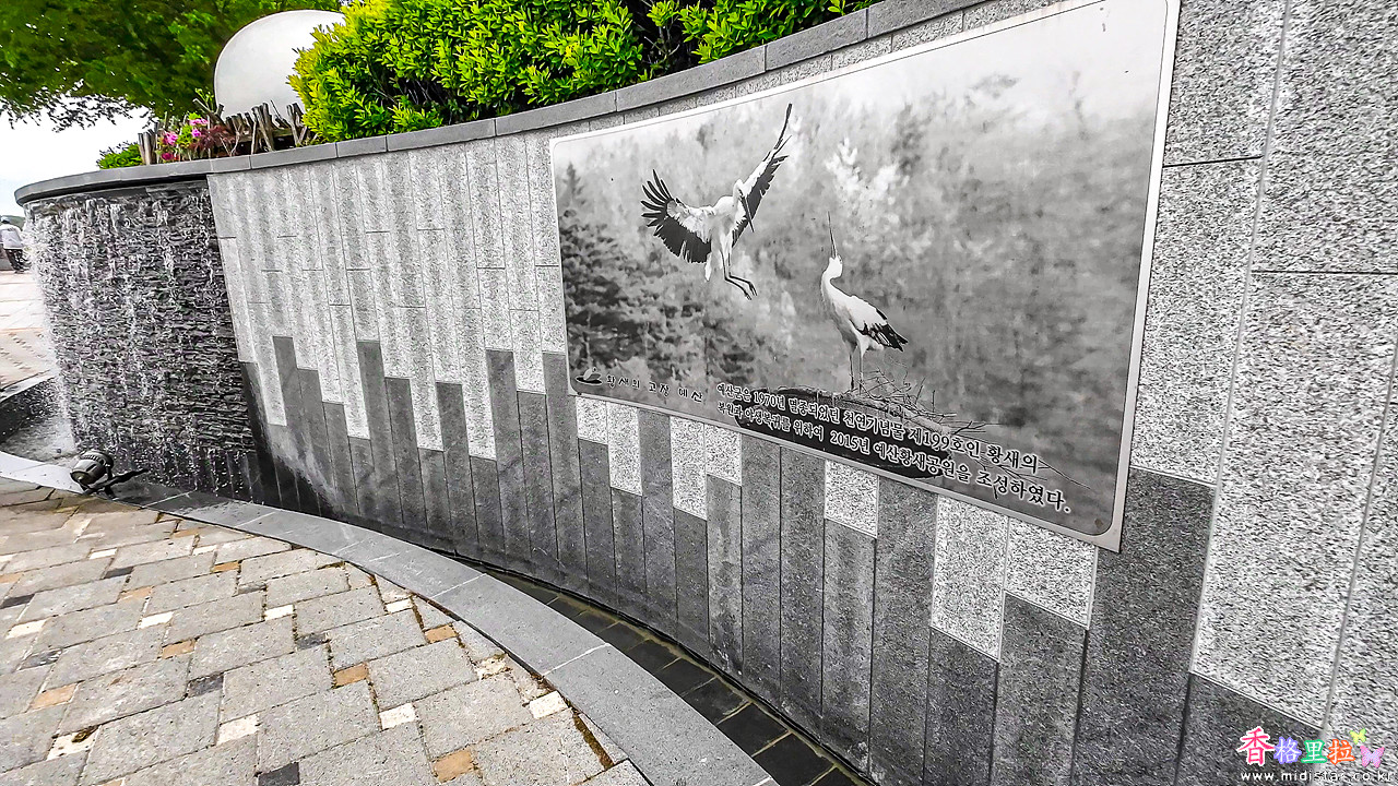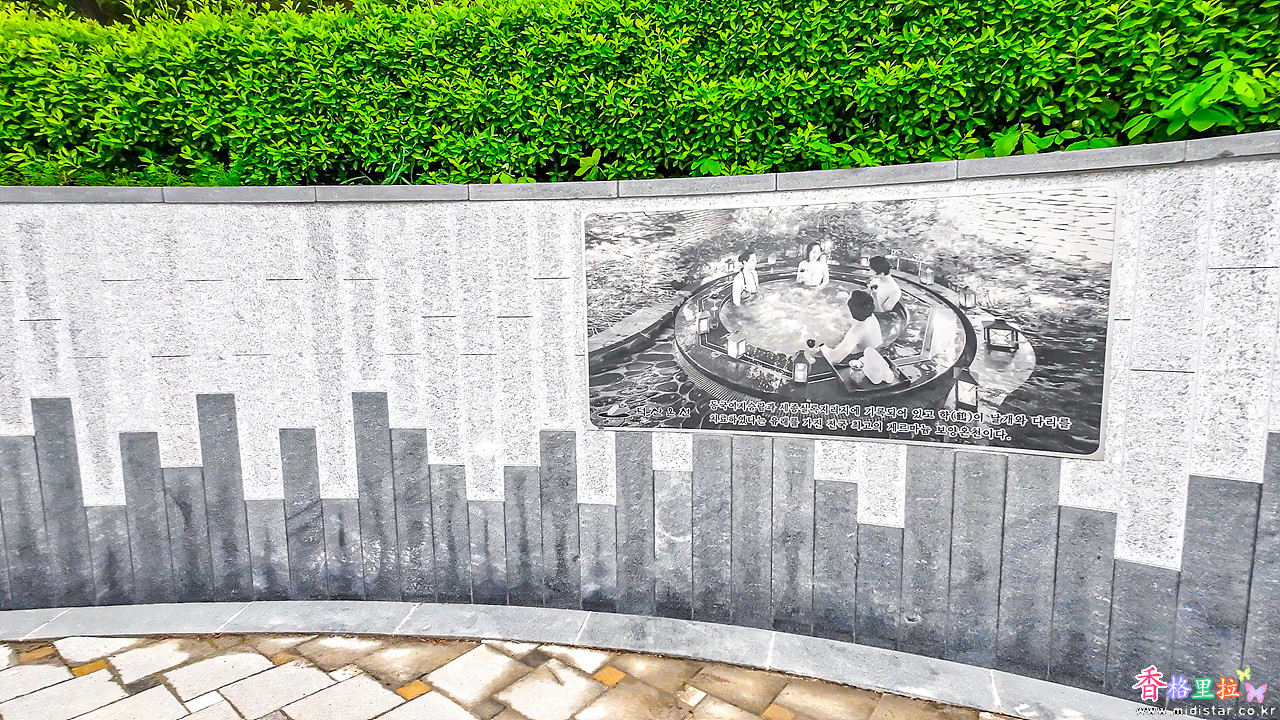 예산을 상징하는 벽화가 있고 벽을 따라 흘러내리는 폭포가 계속 이어진다.