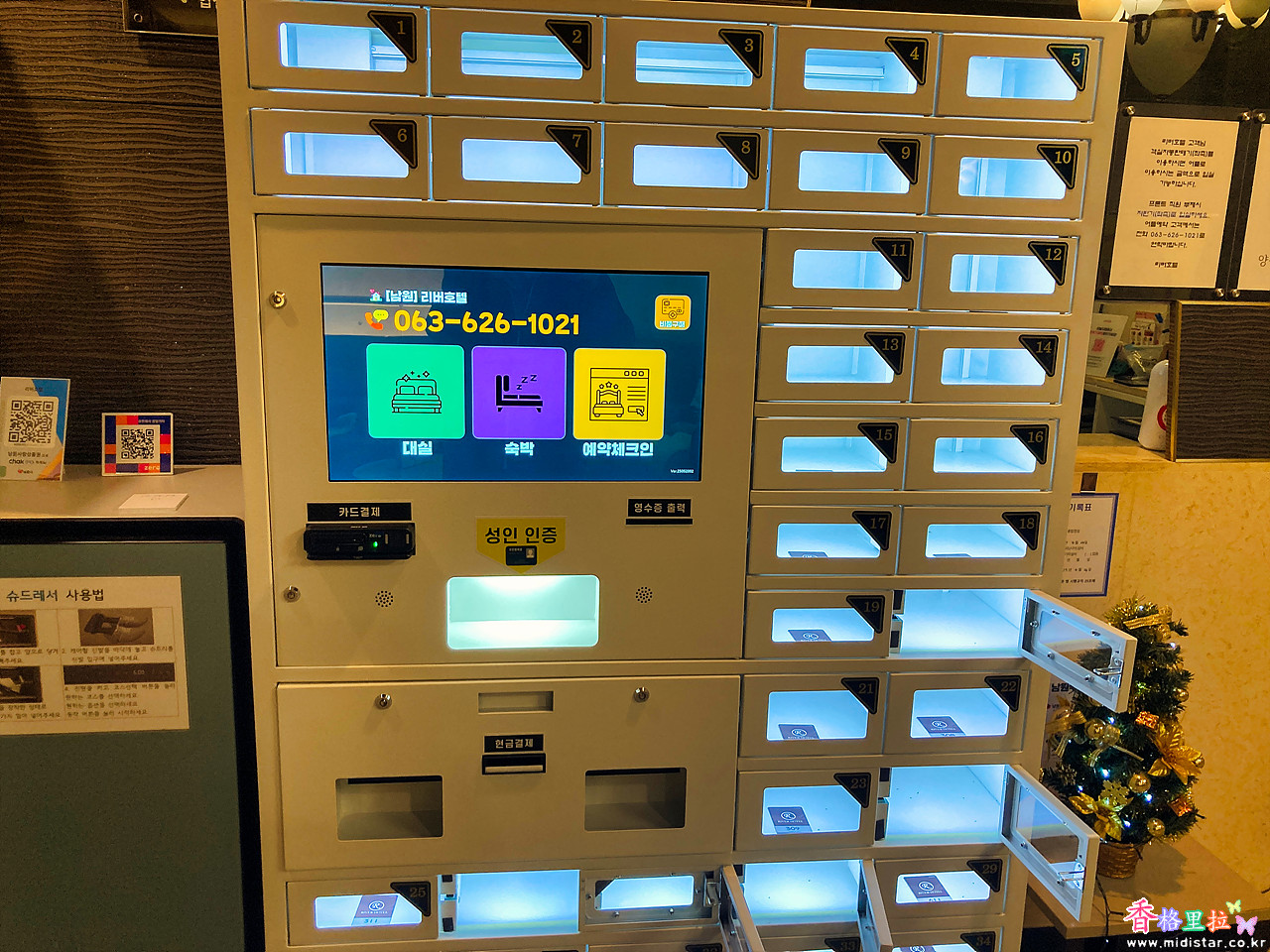 예약체크인을 누르고 예약자 이름을 입력하면 옆의 키박스가 열리는데 방키를 끄집어내면 된다.
