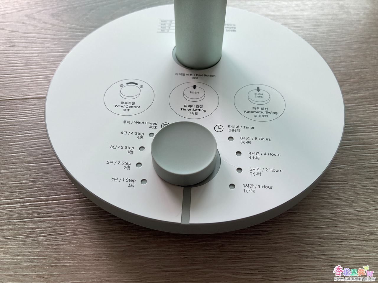 풍속조절, 타이머조절, 좌우회전을 가운데 원형 버튼 하나로 조절 가능하다.