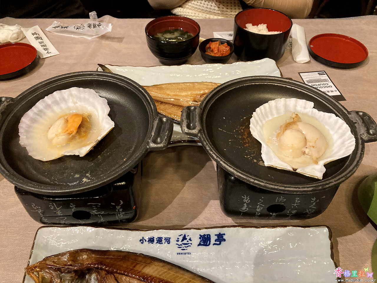 홋케(임연수) 구이와 가리비 한 점씩 세팅된 점심 메뉴이다.