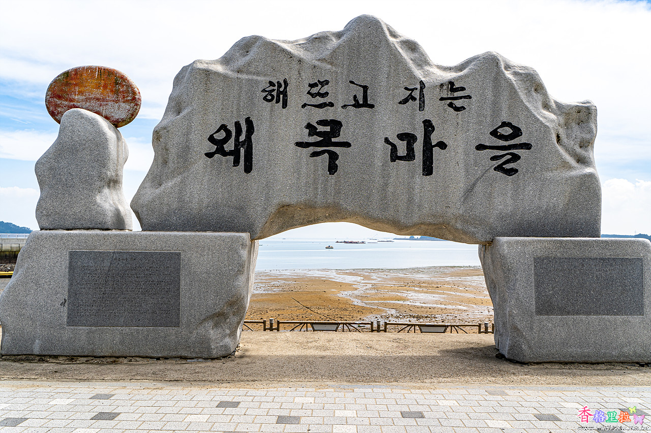 해 뜨고 지는 왜목마을이라는 거대한 돌 비석이 보인다.