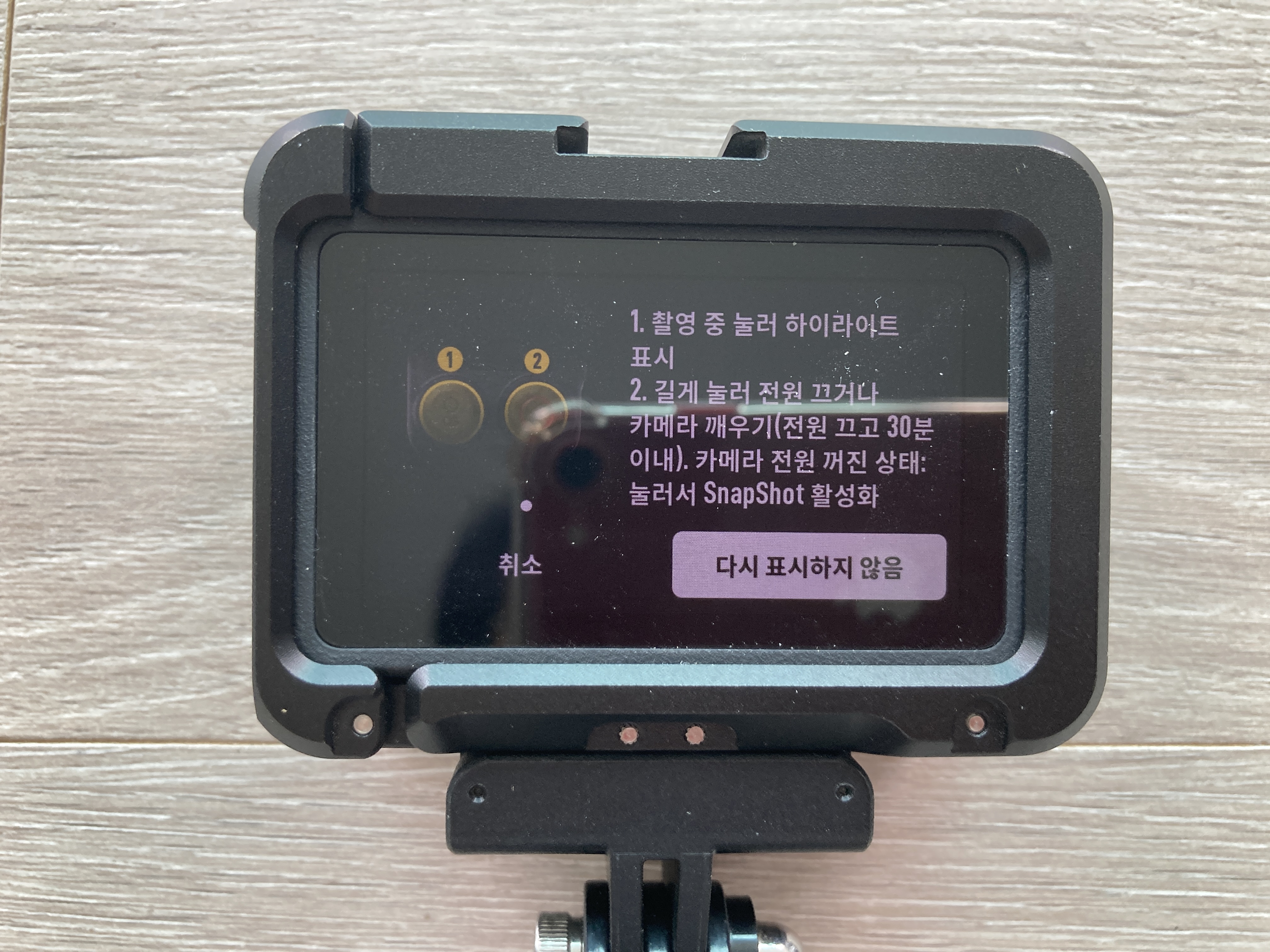 새로 산 자석식 클램프에 액션캠을 바로 결합해도 좋은데 각도 조절이 안 되는 불편함이 있다.