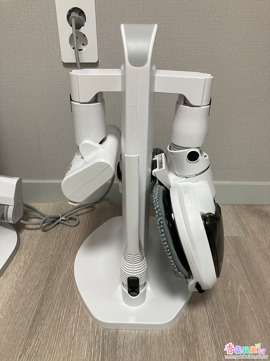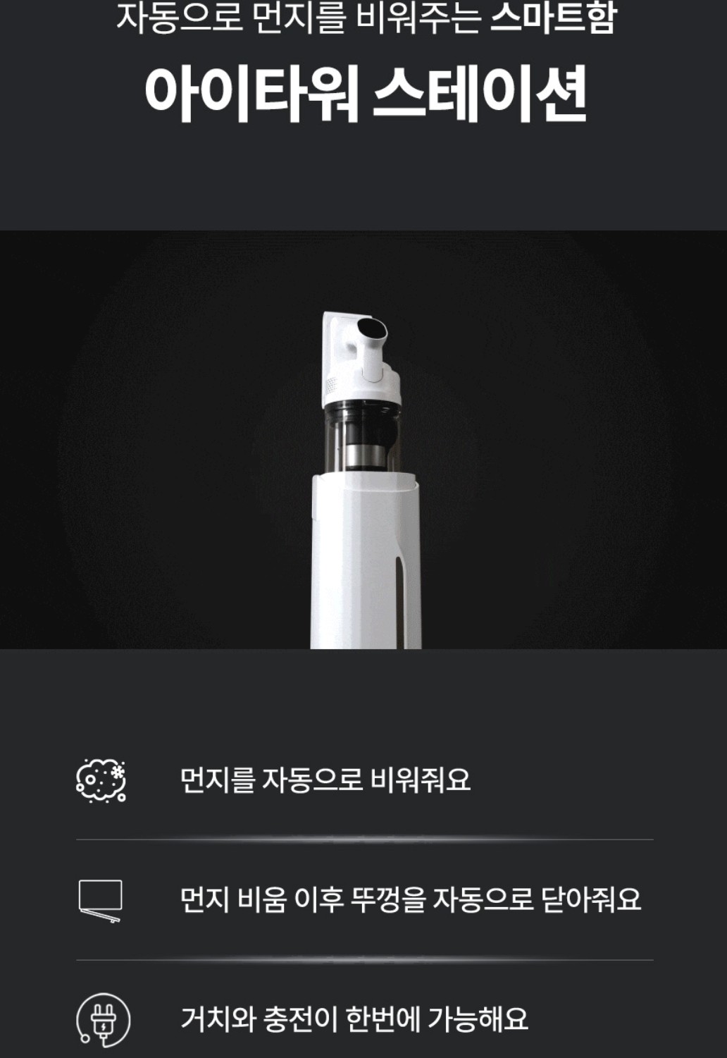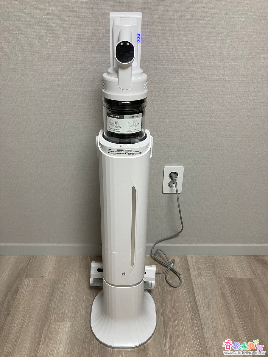 청소기를 꽂으면 자동으로 청소기에 있던 먼지들을 자동으로 아래 쓰레기통으로 배출 한다.