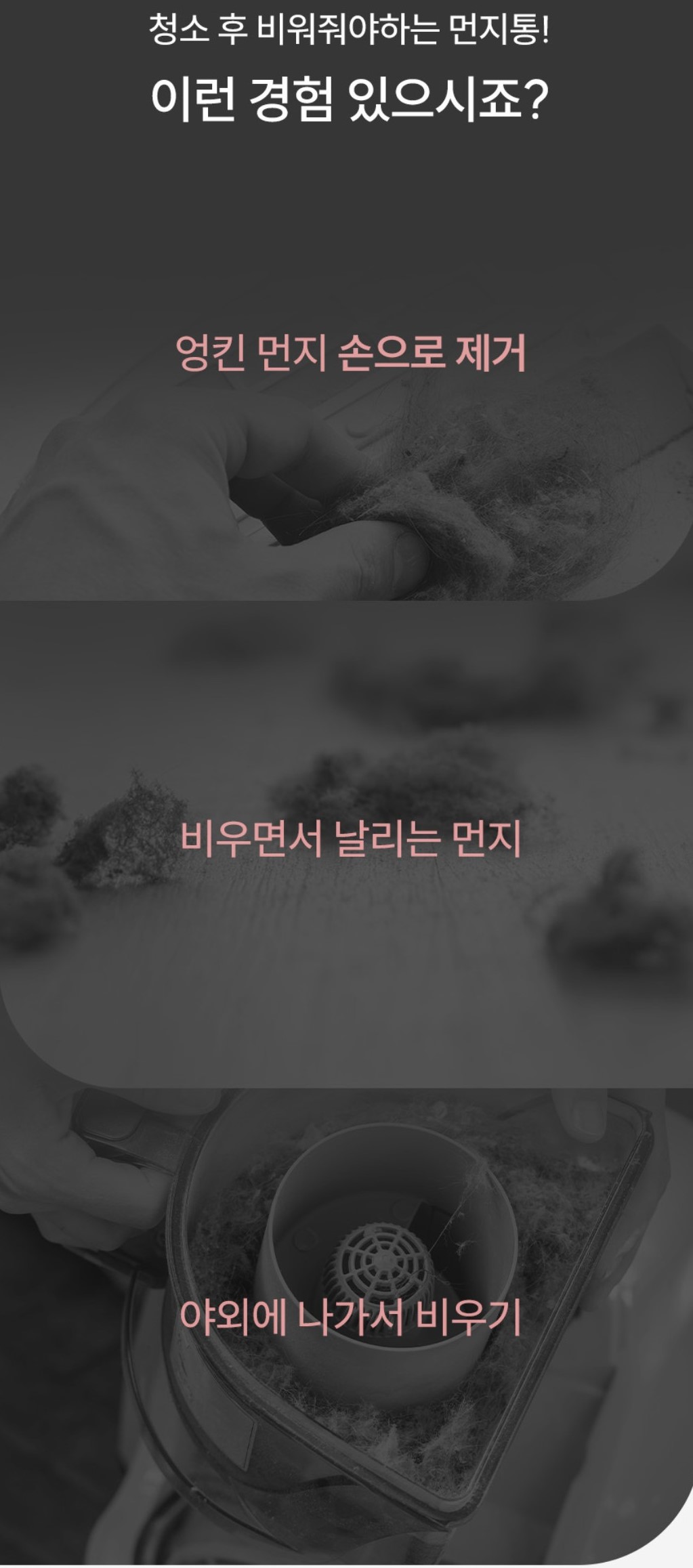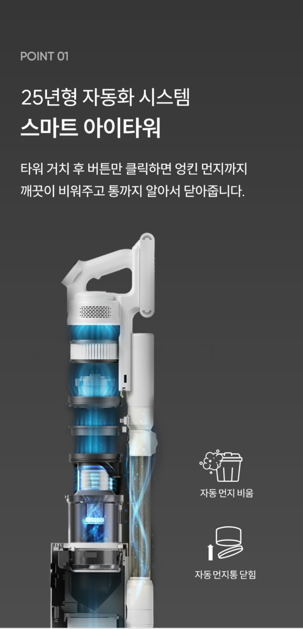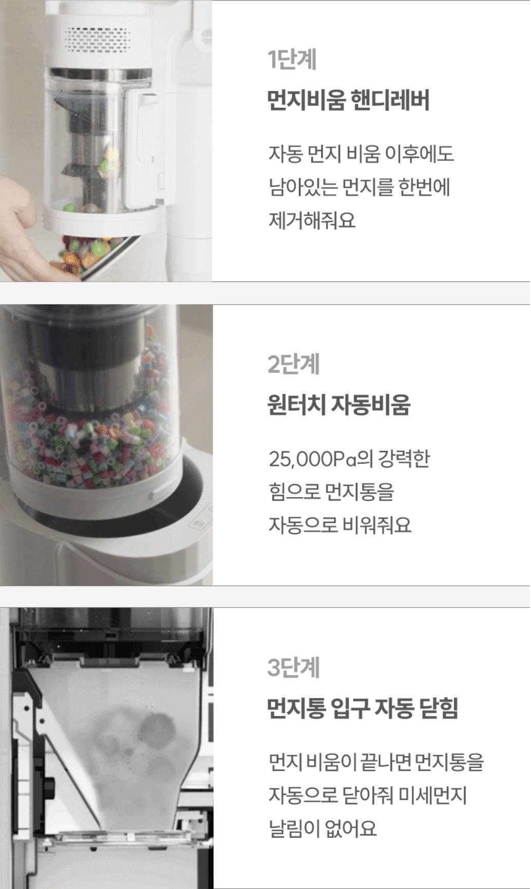 청소기를 꽂으면 자동으로 청소기에 있던 먼지들을 자동으로 아래 쓰레기통으로 배출 한다.