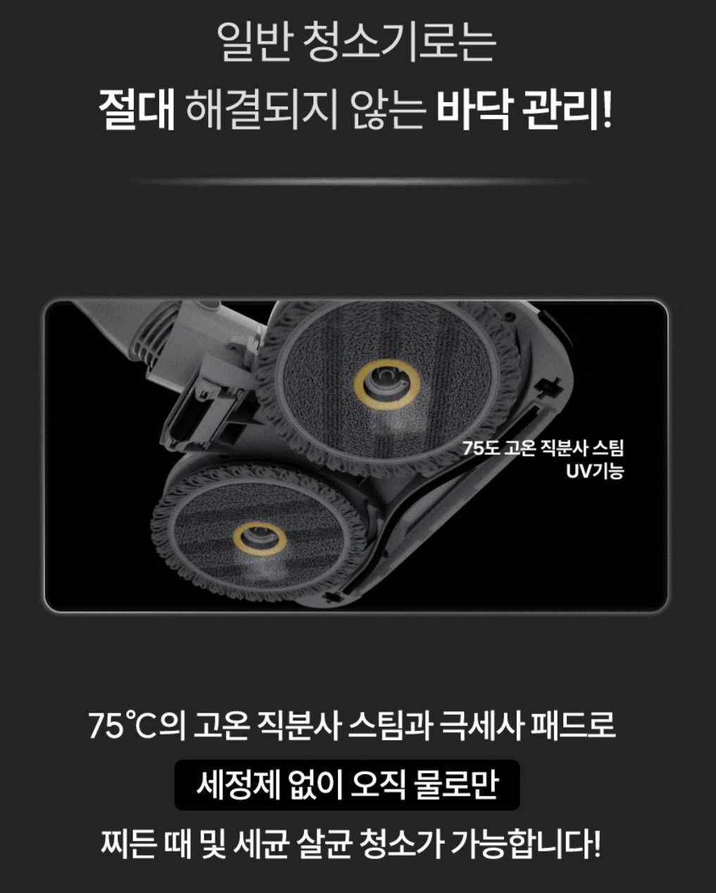 스팀 물걸레 청소를 해보았는데 부하가 많이 걸리는지 정확한 시간을 재보지 않았지만 배터리가 그리 오래 가지 않고 배터리 부족 빨간 불이 들어온다. 다음에 정확하게 시간을 재 보아야 겠다.