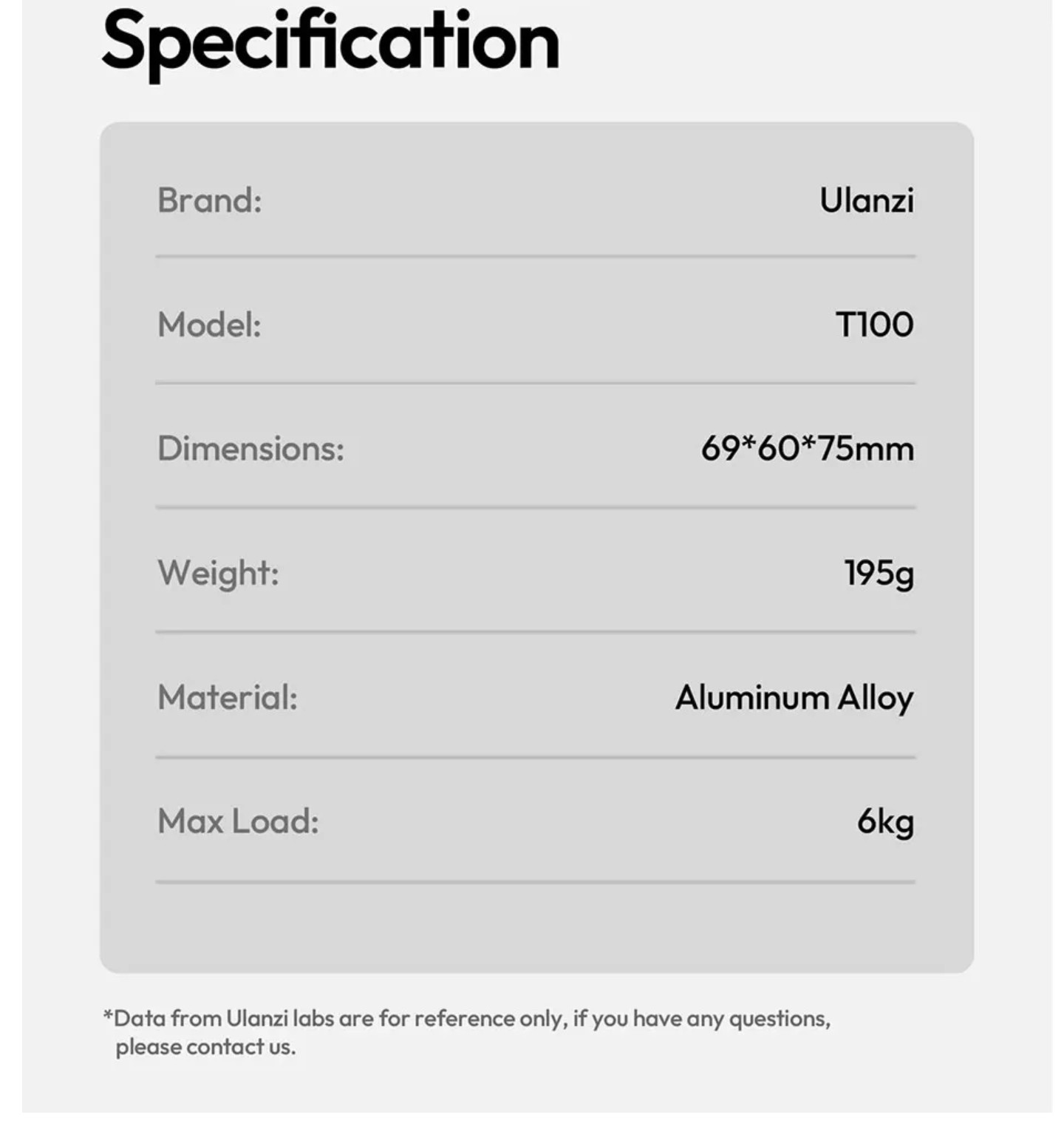 이번에 주문한 울란지(Ulanzi) T100은 사이즈도 작고 최대 6 Kg 까지 가능한 볼헤드이다.