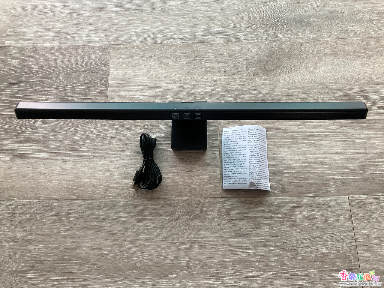 모니터용 램프, USB C Cable, 설명서로 구성되어 있다.