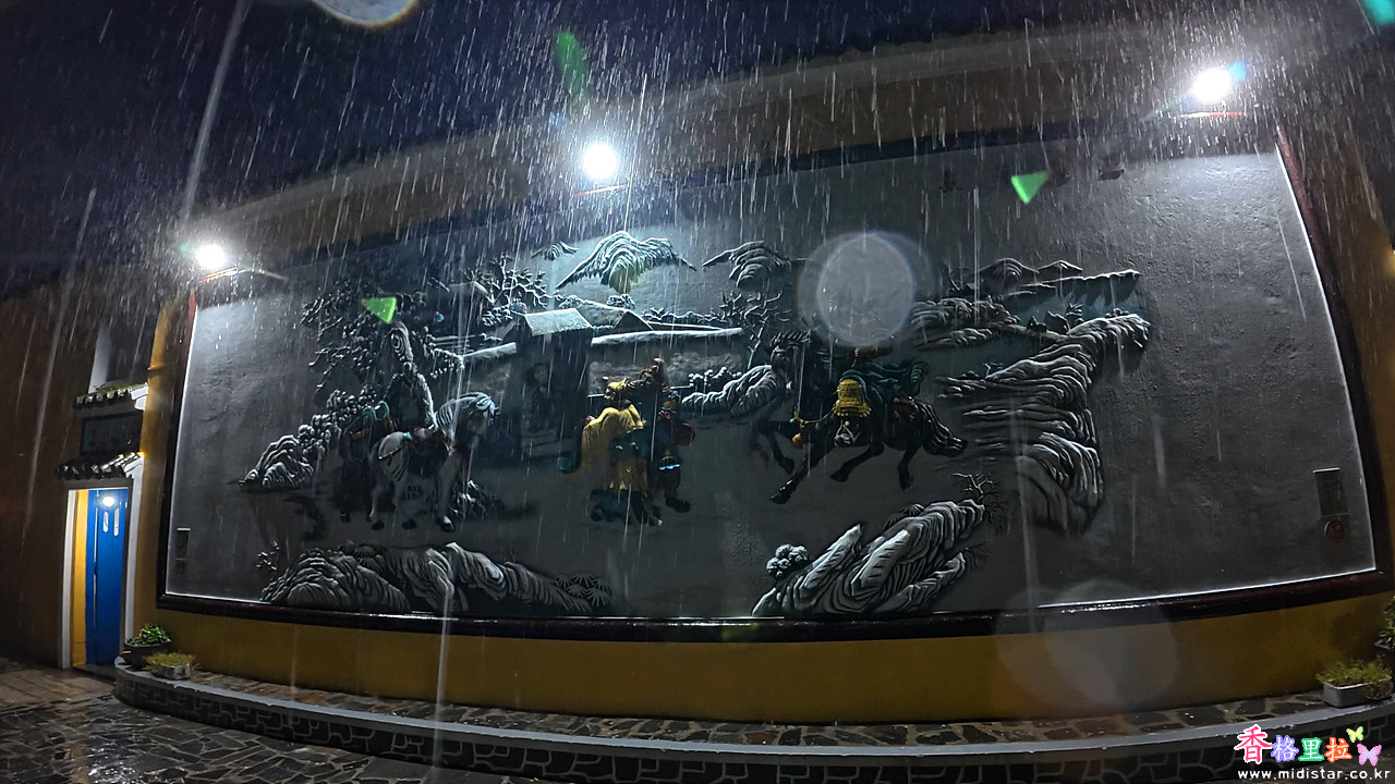 조명이 켜진 상가를 지나가도 비가 와서 더 어두워 흥미가 반감되었다.