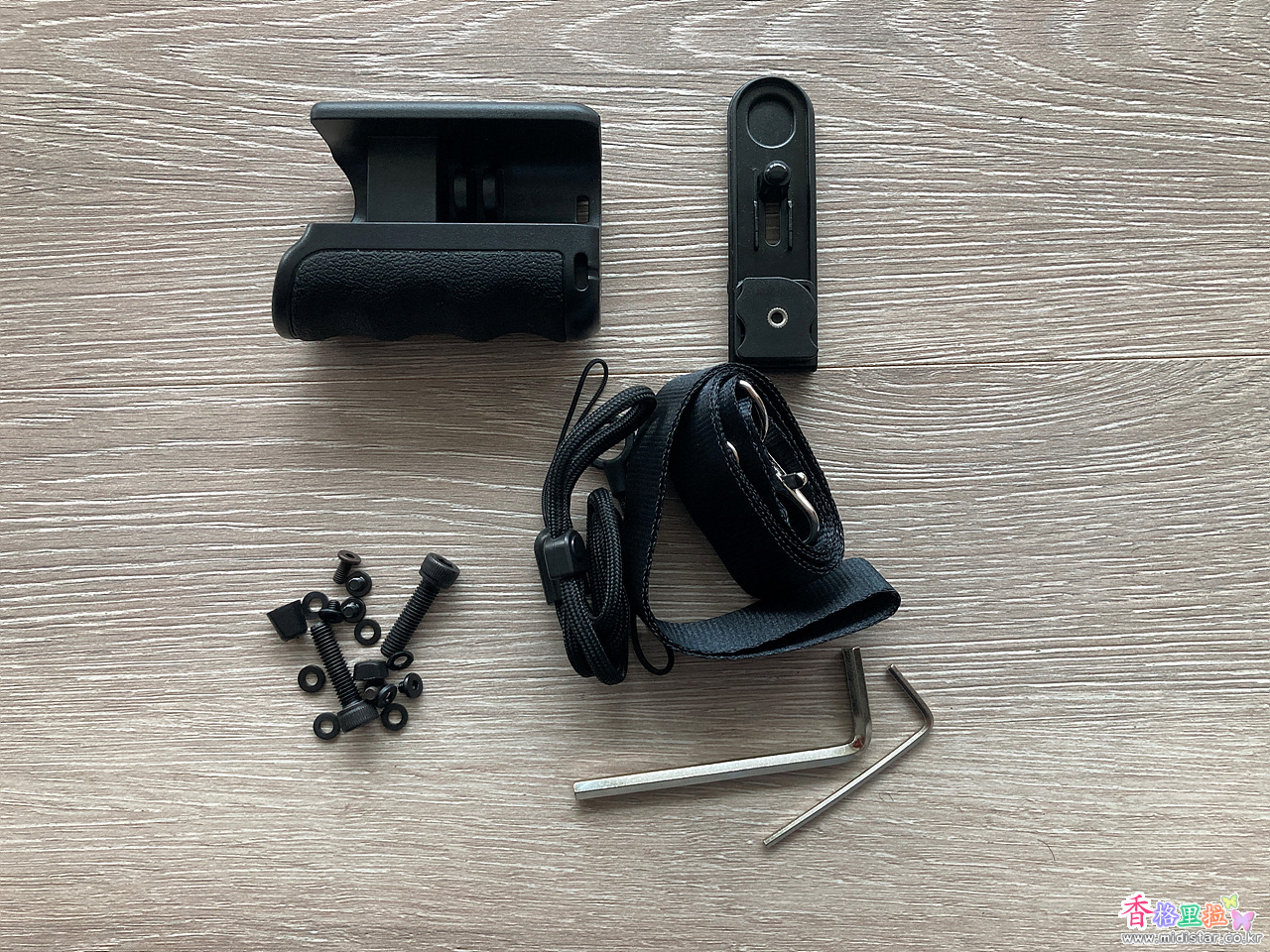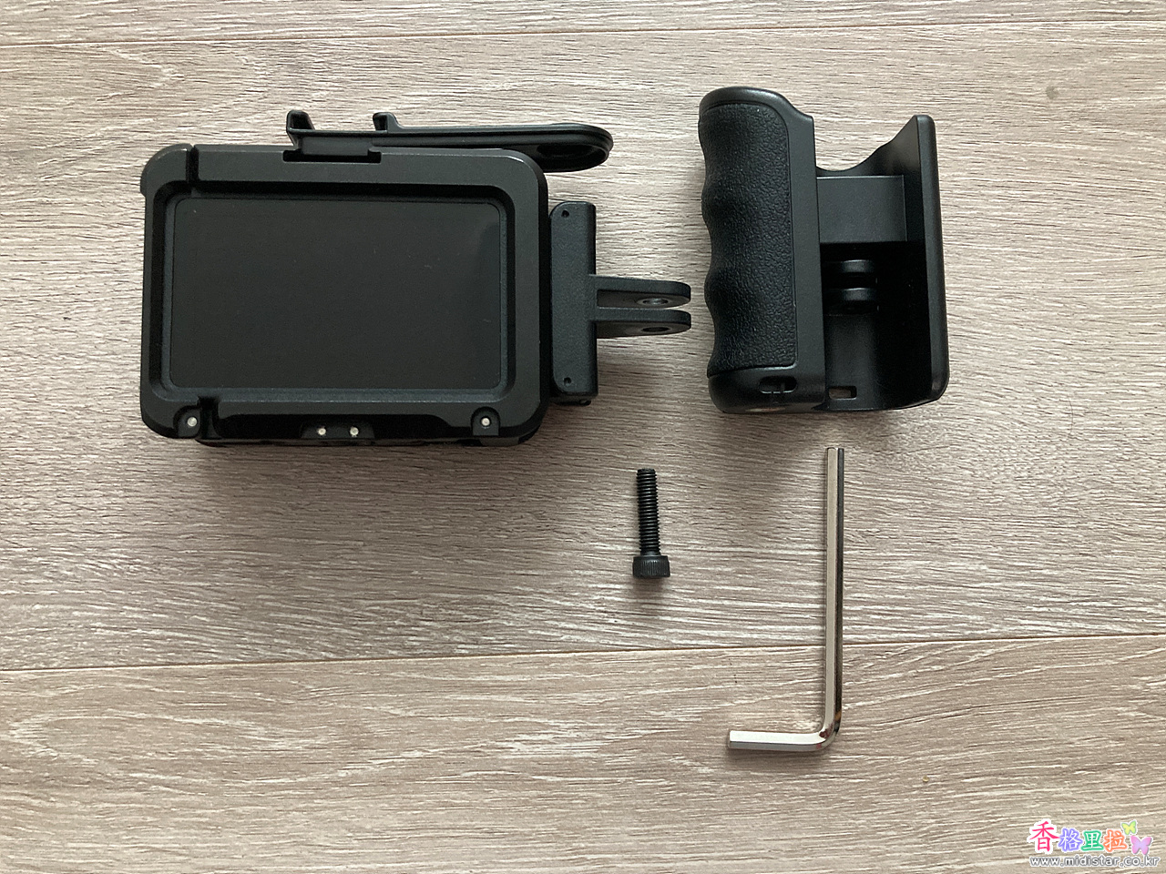 일단 Osmo Action 5의 측면 세로 부분에 자석 클래프를 장착 후 핸드 그립 부분을 결합해 준 다음 L 렌치로 조여준다.