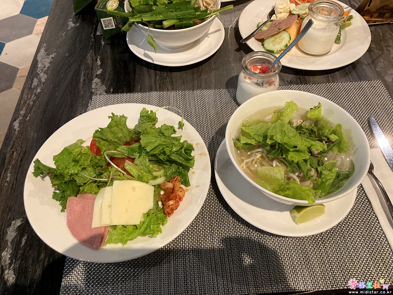 주인이 한국인인지 수저 커버에 "마담차 식당 맛있게 드세요"라고 쓰여 있다.