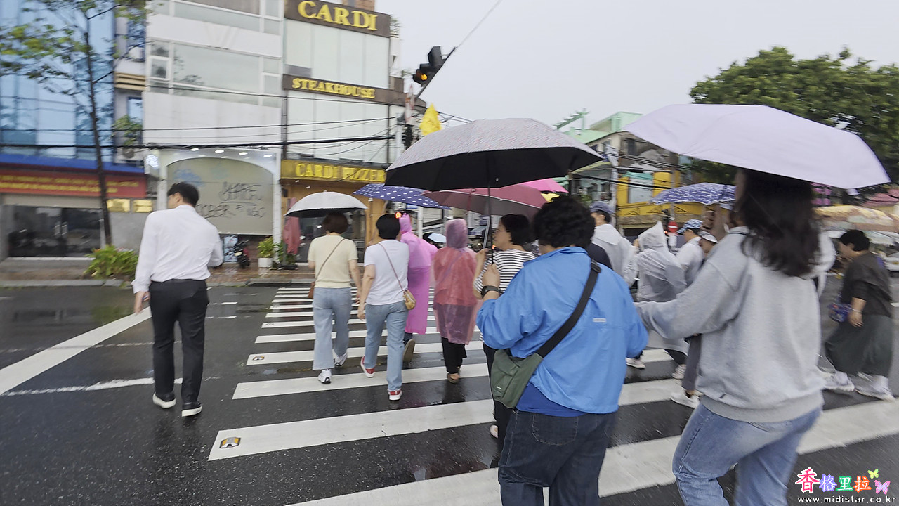 비 맞으면서도 관광객 발길이 멈추지 않는다.