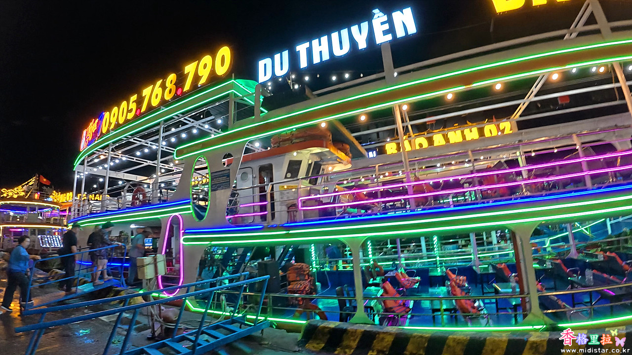 선착장 주차장에 도착하니 휘황찬란한 조명으로 장식한 배들이 즐비하게 늘어서 있다.