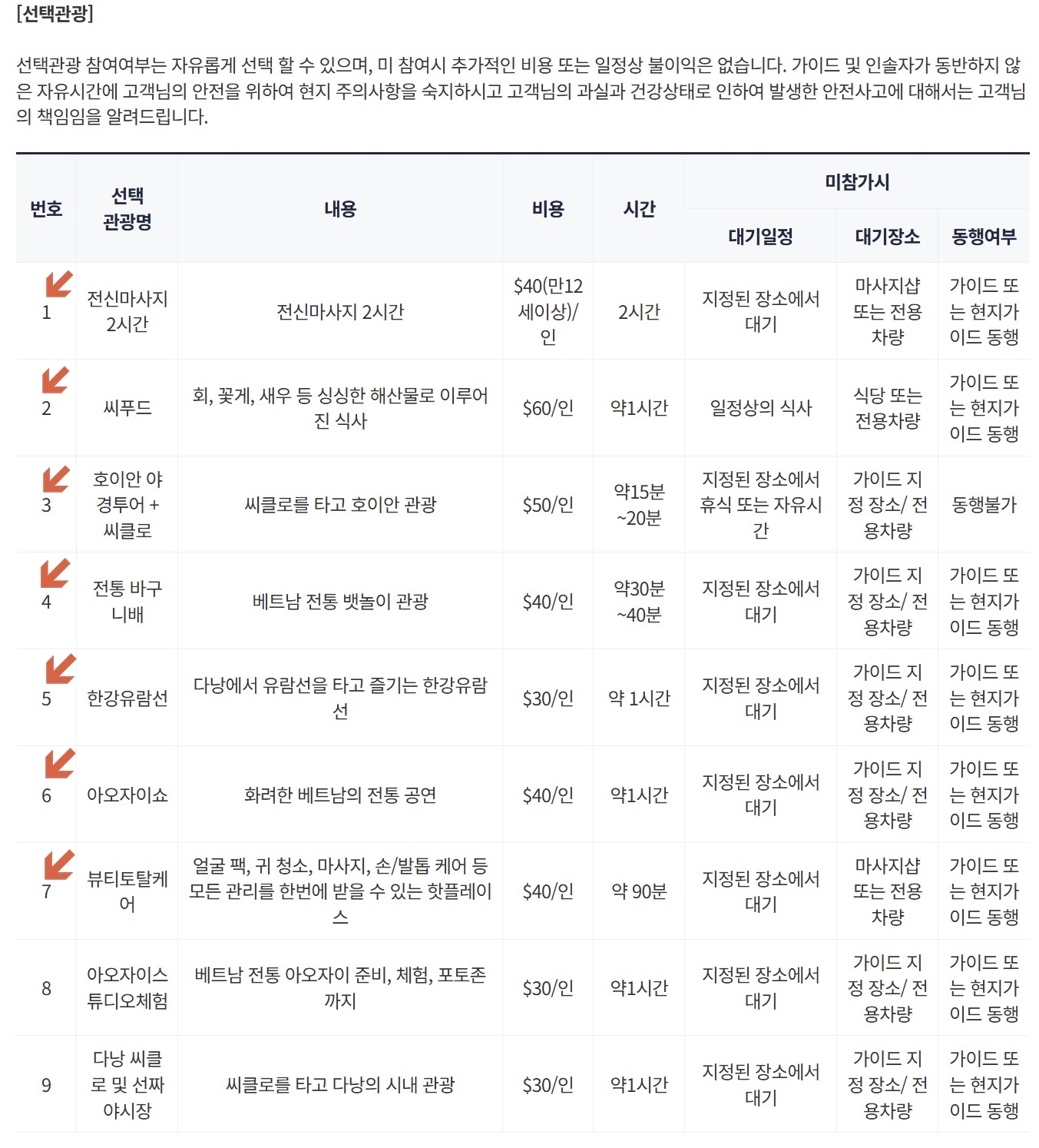 씨푸드 요리는 1인당 60달러 선택관광 항목이다.