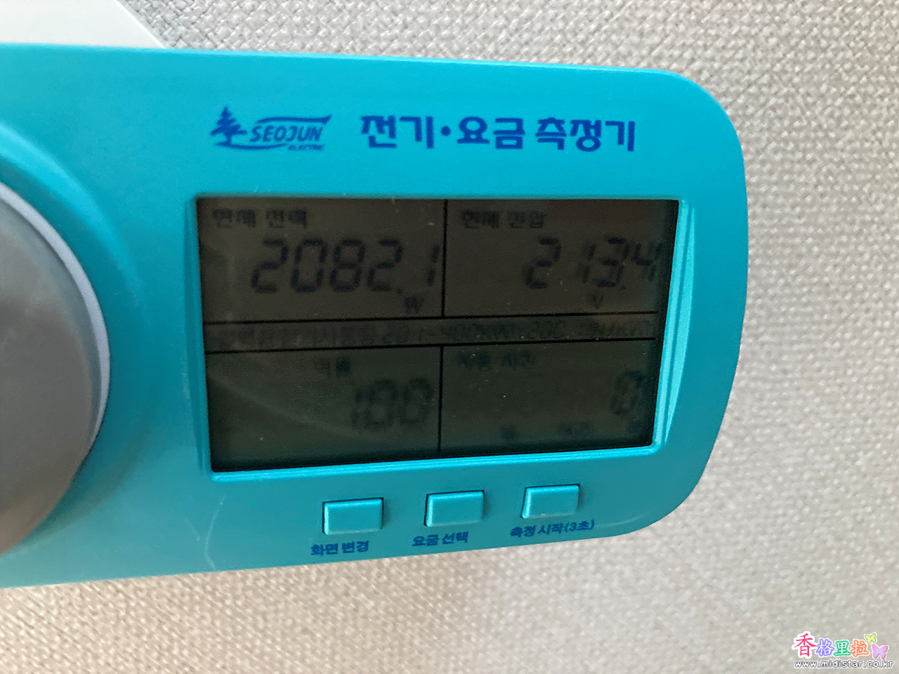 온풍기를 가동 후 측정시작 버튼을 3초 이상 누르면 전기요금이나 현재 전력을 측정하기 시작한다.