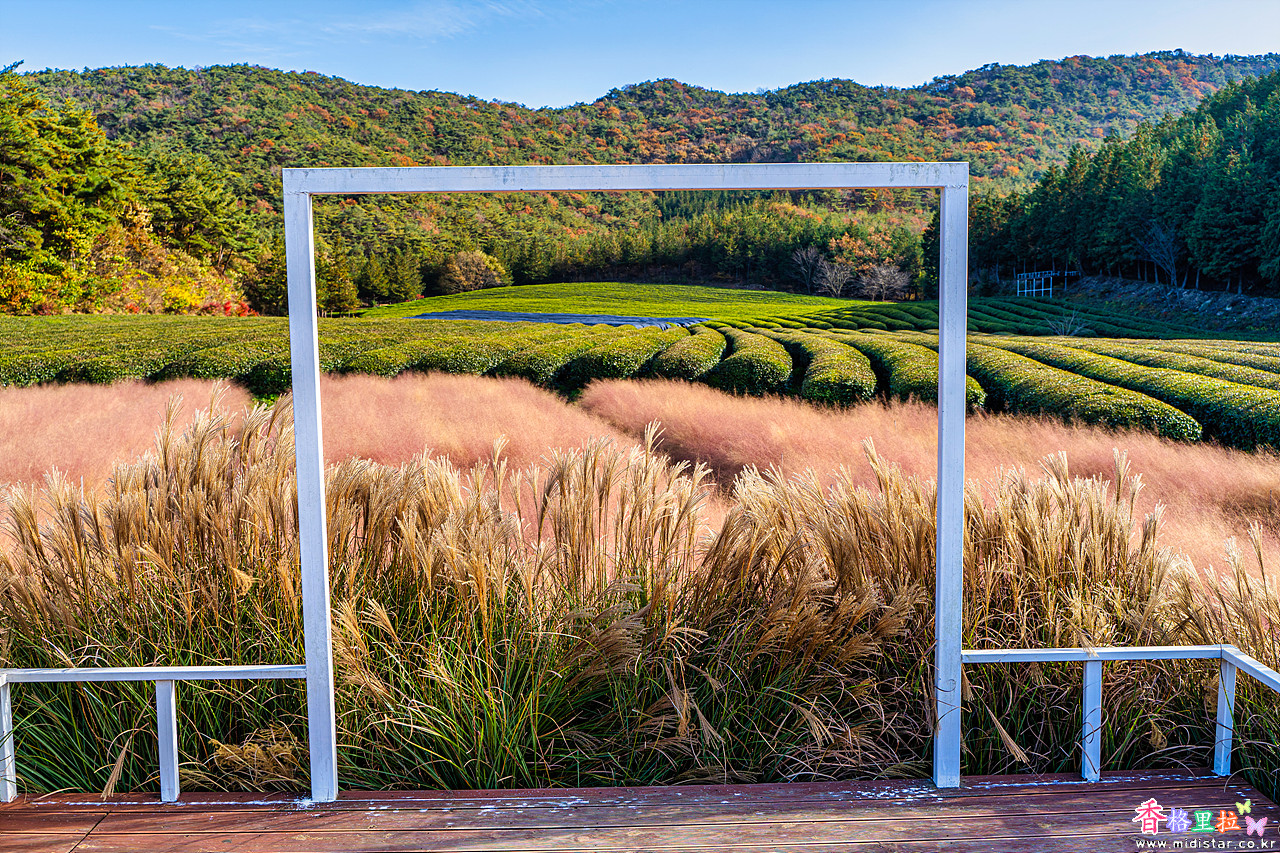 핑크뮬리 뒤쪽으로 녹차밭이 펼쳐져 있다.