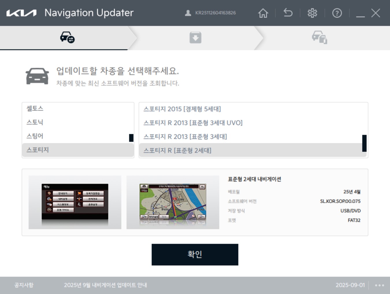 업데이트할 차종과 스포티지 R [표준형 2세대] 내비게이션을 선택.