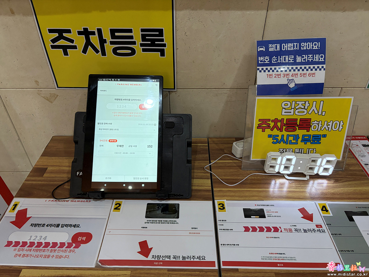 입구로 들어가면 바로 주차등록을 할 수 있는데 차량의 뒷자리 번호 4개를 입력하면 5시간 무료주차 이용이 가능하다.