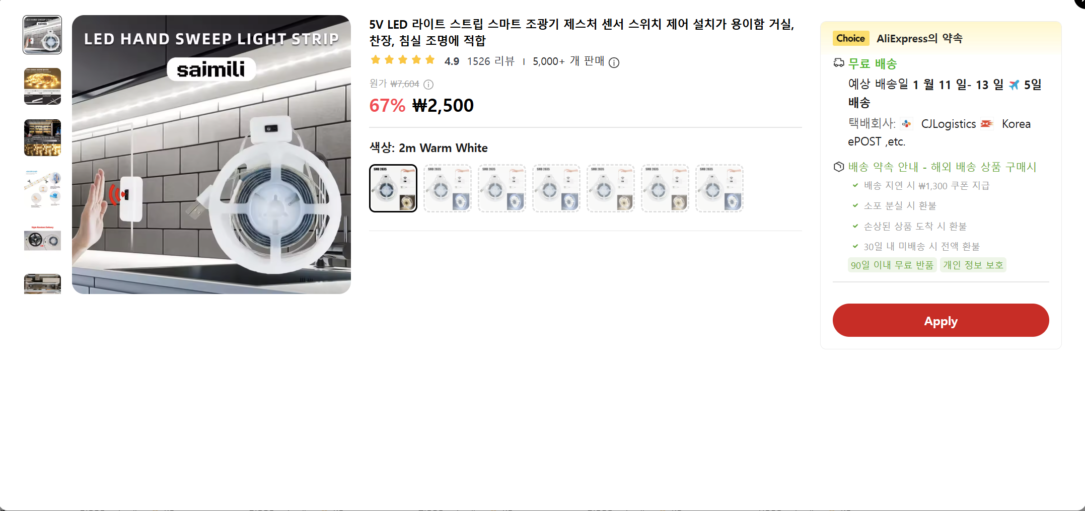 지난번에 구입한 220V LED Strip Lamp의 스위치가 수동식으로 불편한 것 같아 동작 반응 센서 스위치가 있는 제품으로 재 구입.
