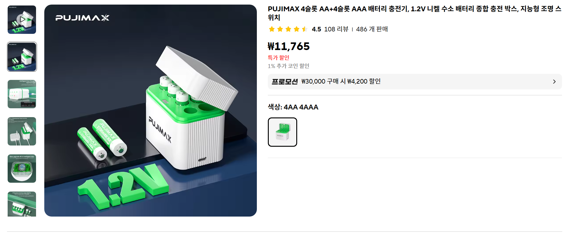 배터리 AA 4개, AAA 4개를 동시 충전할 수 있는 충전기