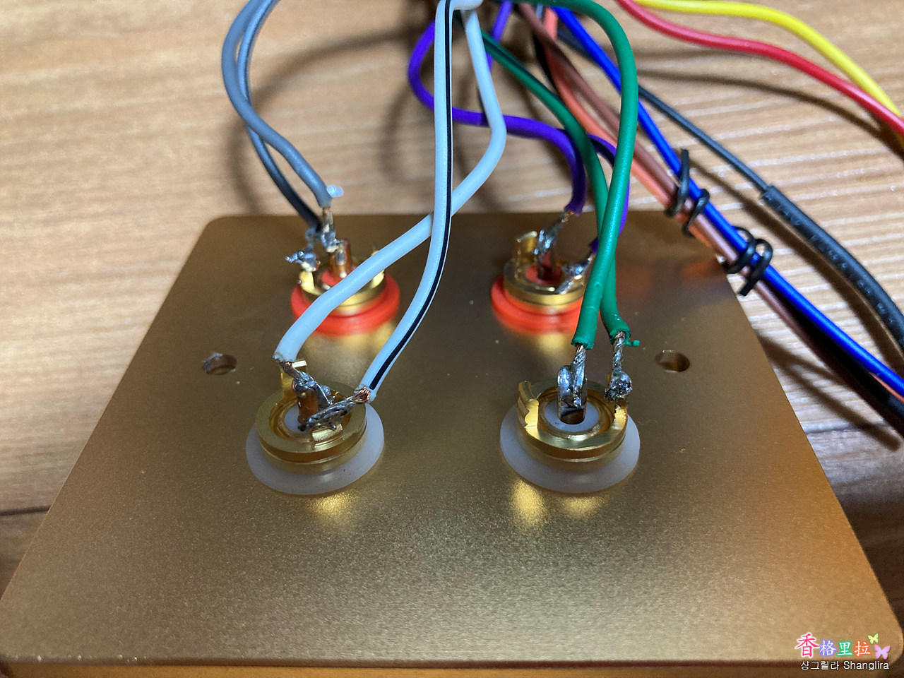 흰색은 흰색끼리 녹색은 녹색끼리 보라색은 보라색끼리 회색은 회색끼리 단자에 납땜해 주면 되는데 검은 줄이 있는 선이 - 선이라 베이스(-) 단자에 납땜해 주었다.
