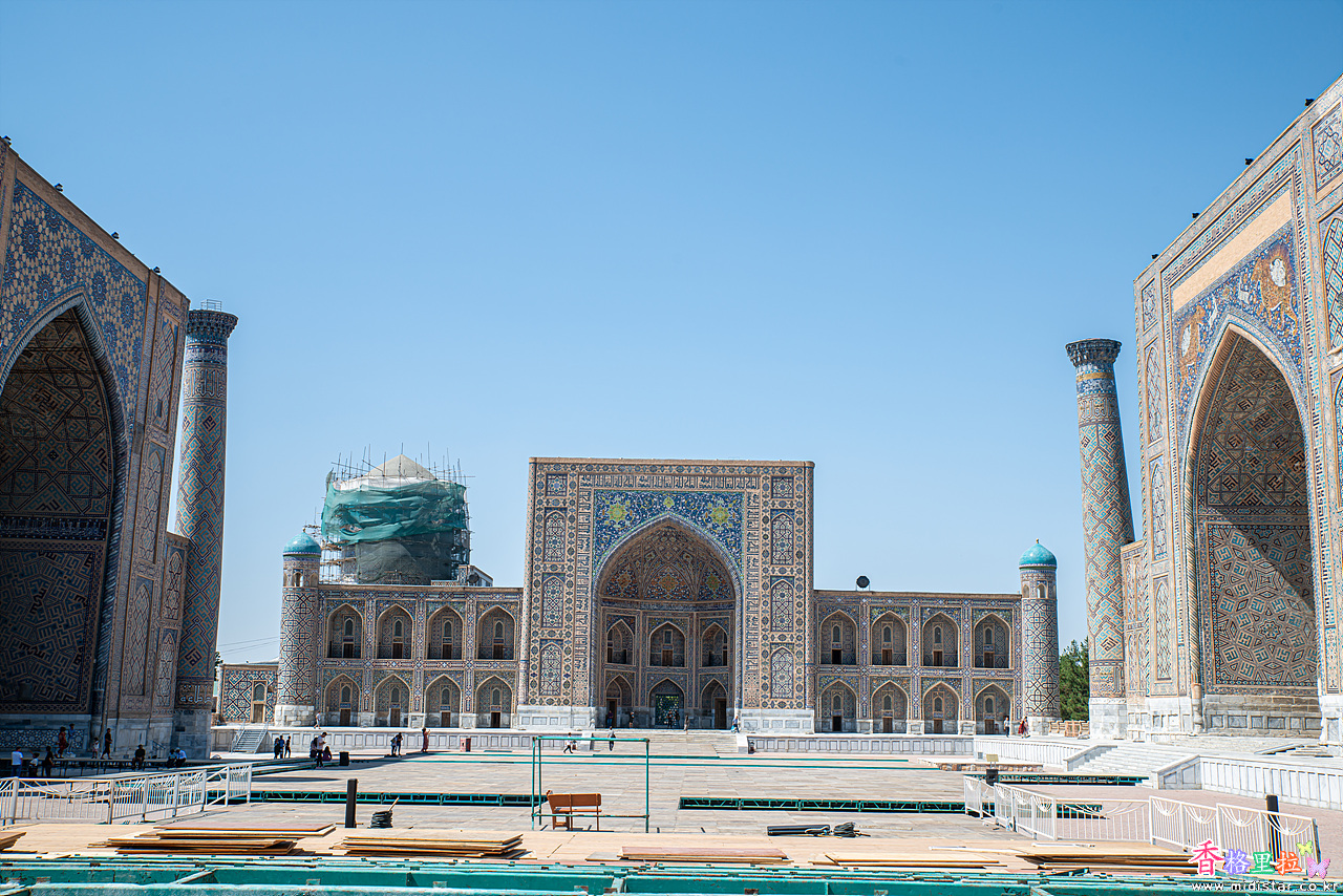 중앙이 티라카리 마드라사, 오른쪽이 셰르도르 마드라사, 왼쪽이 울루그 베그 마드라사이다.