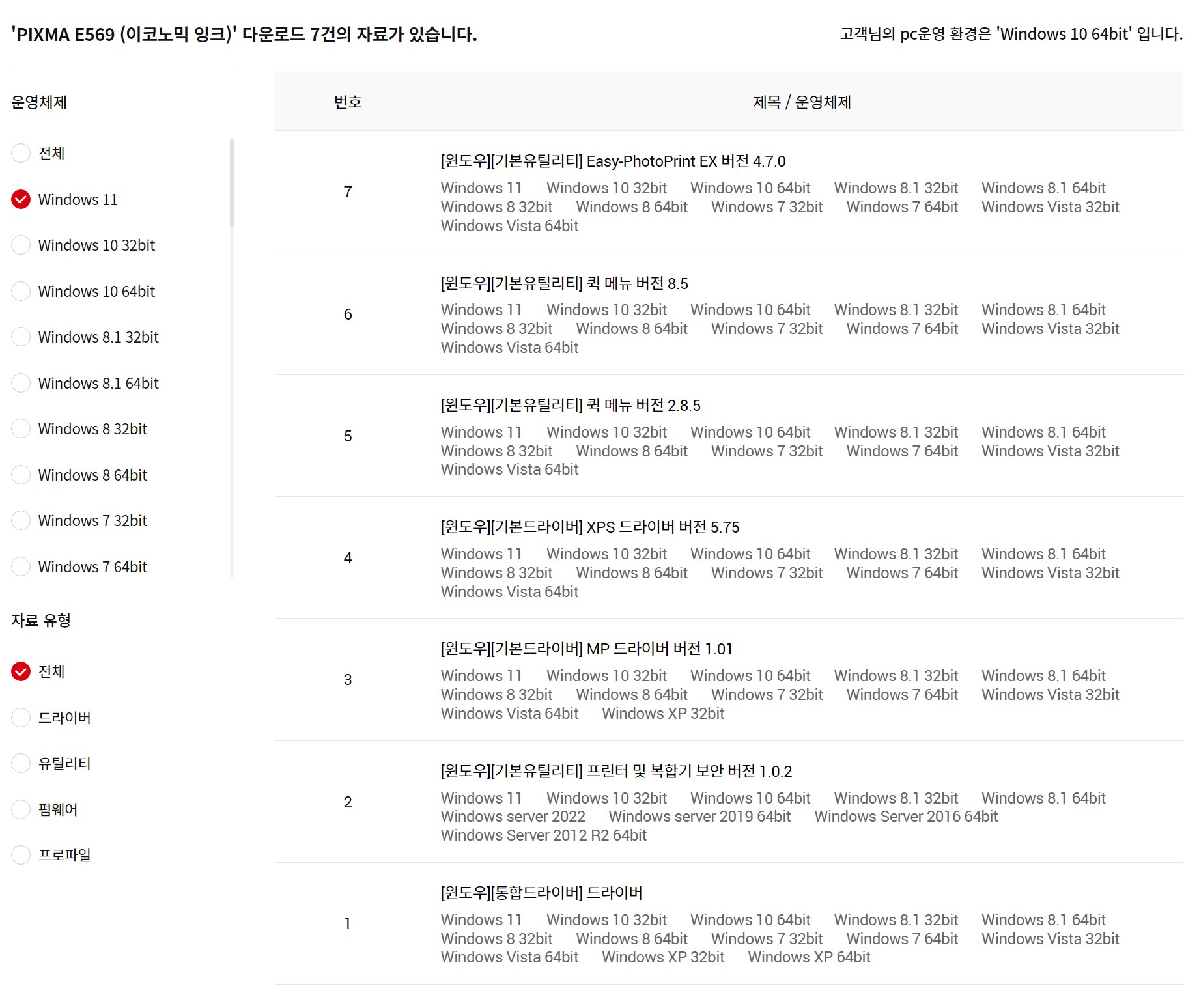 복합기> 잉크젯 복합기> Fixma E569를 선택해서 1번의 윈도 통합드라이버를 다운로드한다.