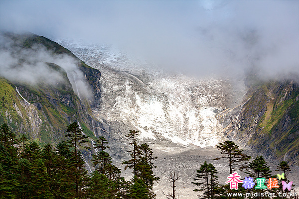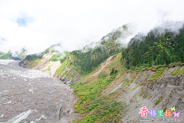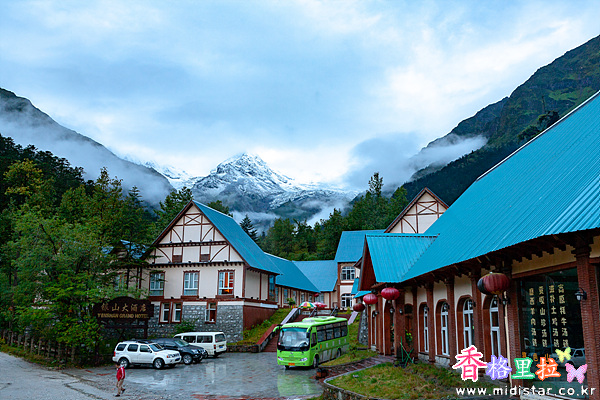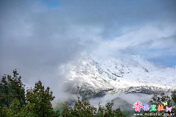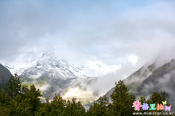 야라 설산( 拉雪山, 5820m)이 희미하게 보인다.비내리는 가운데 사진을 찍지만 별로다.