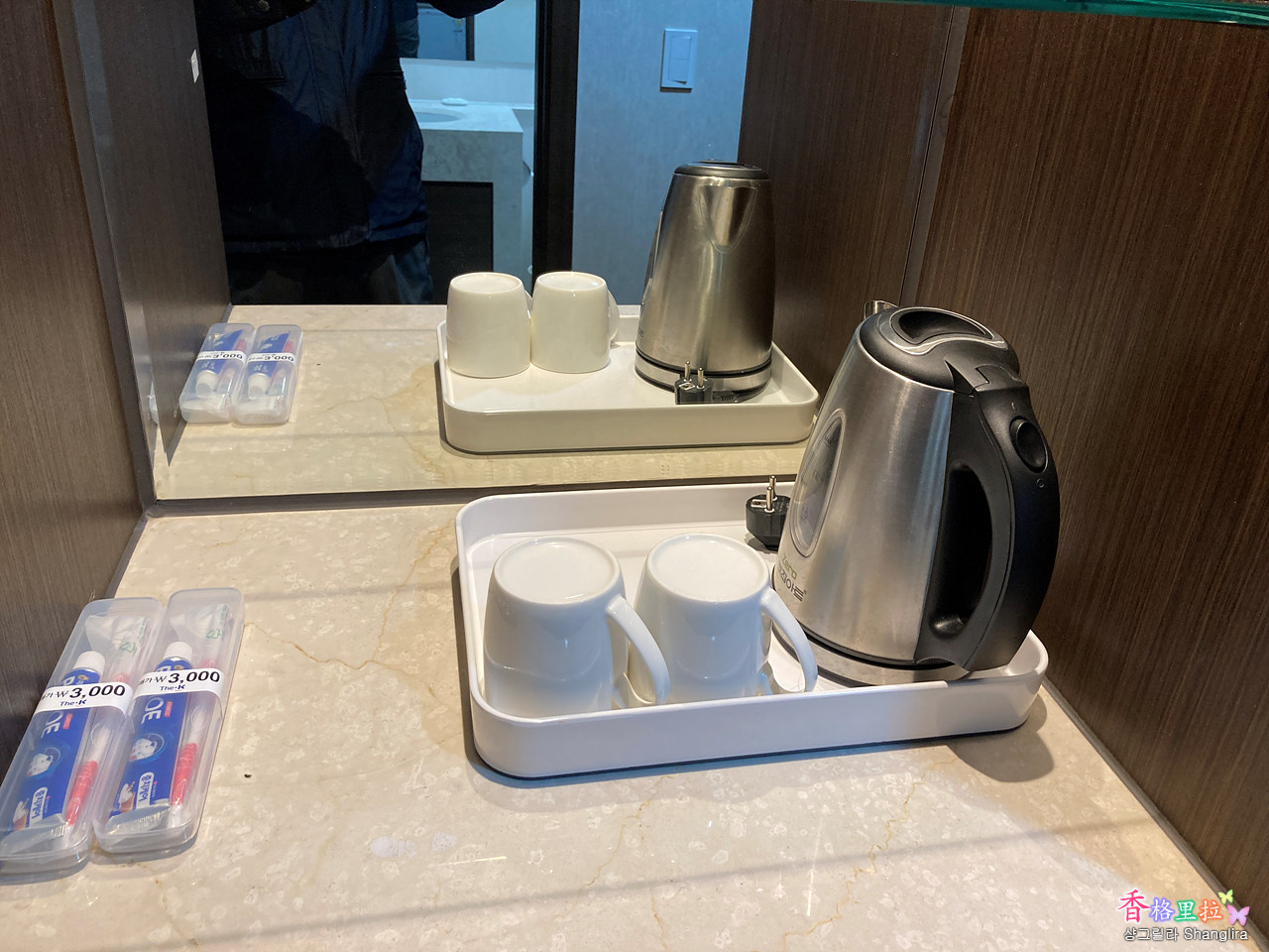 커피 포트는 있는데 전원 코드를 꽂을 콘센트가 없다. 그래서 침대 옆 탁자 옆의 콘센트를 이용해야 한다. 이런 사소한 점이 개선되지 않고 운영된다는 것이 의아스럽다.