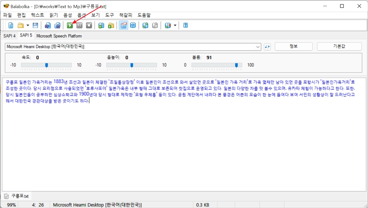 프로그램 실행 후 텍스트를 입력 한 후 메뉴에서 재생 버튼(화살표)을 누르면 텍스트를 읽어준다. 속도, 음높이, 볼륨을 조절 할 수 있다.